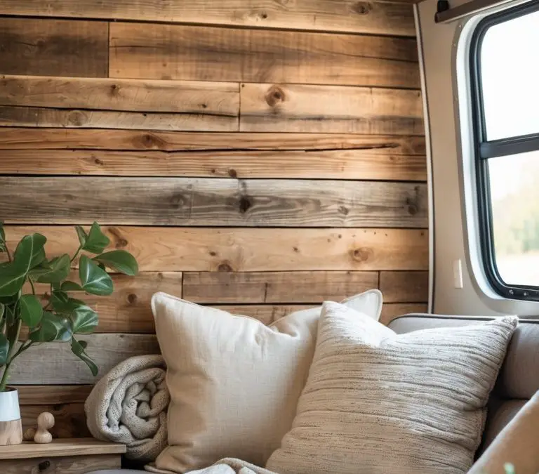 Install thin shiplap or tongue-and-groove planks to keep weight down and fit RV framing. Stain or seal the planks to protect them from moisture and temperature swings while keeping the rustic grain visible.