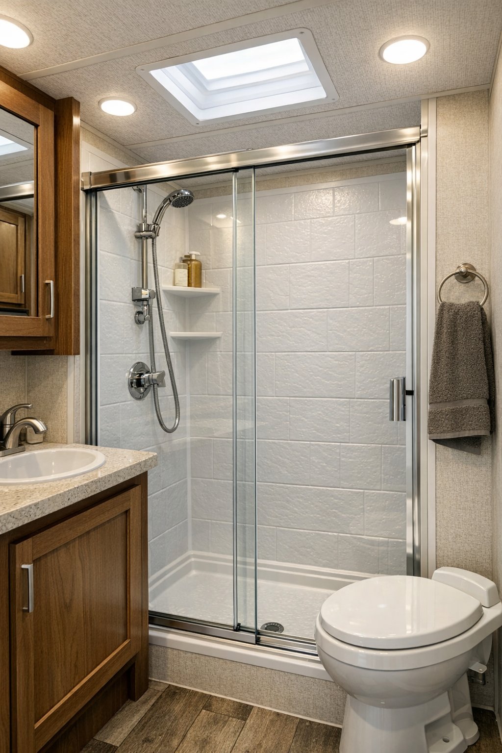 Peel-and-stick tiles give your RV bathroom a fresh look without heavy work. You can pick waterproof vinyl designs that mimic wood, stone, or tile and still keep weight low.