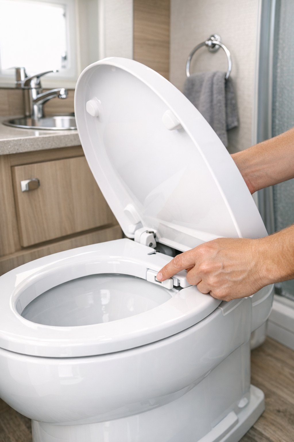 Swapping your RV toilet seat for a quick-release model makes cleaning faster and easier. These seats unclip with a button or latch so you can lift the whole seat off the bowl for a deep clean.