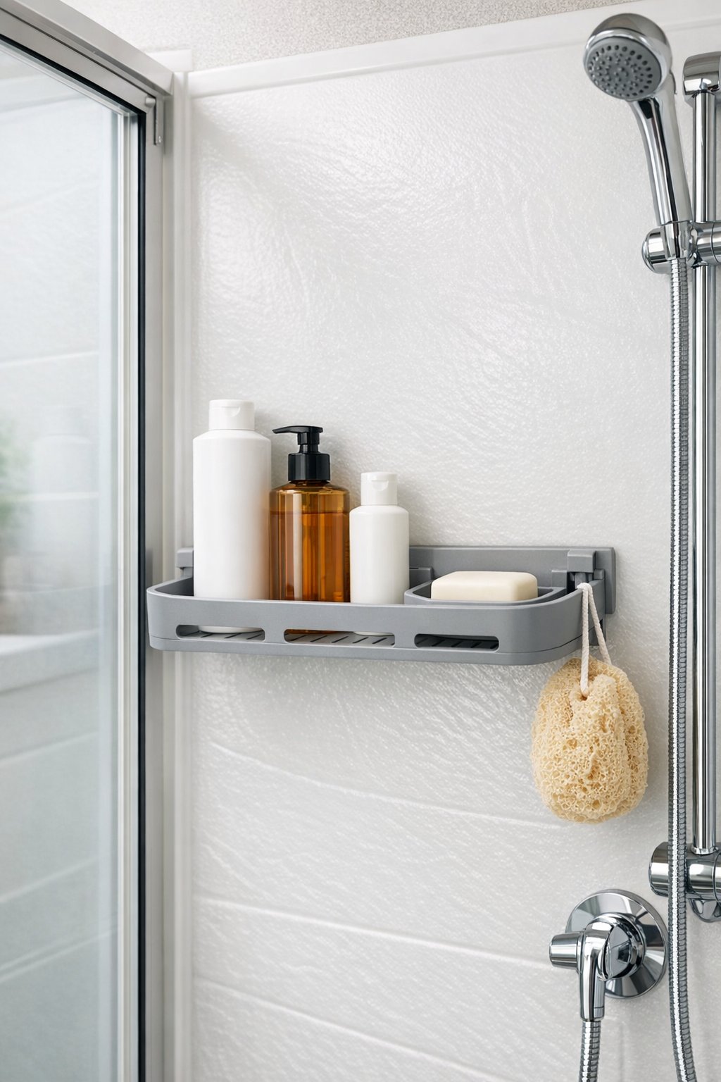 A removable shower shelf gives you extra storage without permanent changes. You can add one in minutes and take it down when you need more space or when you sell the RV.