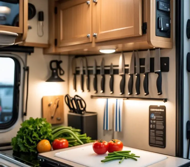 Interior of a pop-up camper galley with a magnetic knife strip and an open fold-down prep shelf holding a cutting board and vegetables.